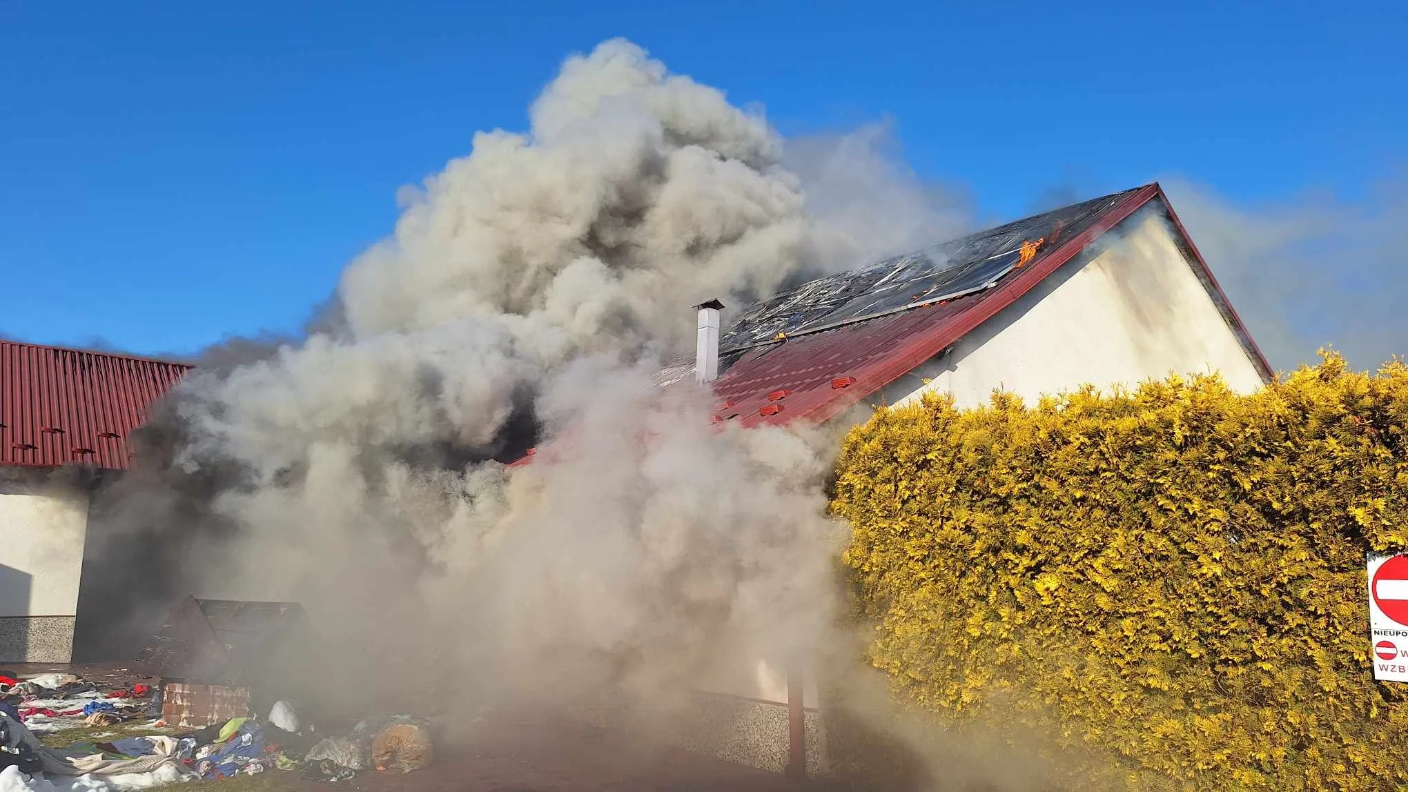 Ogień objął garaż, na którego dachu znajdowała się instalacja fotowoltaiczna. Sytuacja jest szczególnie niebezpieczna, ponieważ w garażu może znajdować się aż 2000 litrów substancji łatwopalnej, najprawdopodobniej oleju opałowego.
