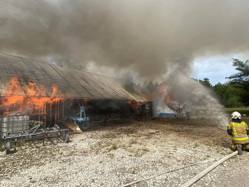 Po przybyciu na miejsce okazało się, że pożarem objęty był cały budynek gospodarczy – stodoła. Strażacy natychmiast przystąpili do działań, które polegały na zabezpieczeniu miejsca zdarzenia, odłączeniu dopływu prądu do budynku oraz gaszeniu pożaru. W celu skutecznego ugaszenia ognia konieczna była również rozbiórka części dachu oraz drewnianego stropu, na którym znajdowały się snopki siana i słomy.