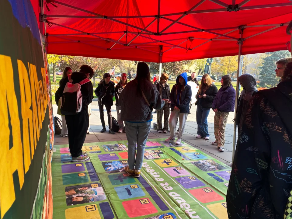 Kolejnym punktem programu była Przestrzenna Gra Planszowa, która zyskała ogromne zainteresowanie zwłaszcza wśród starszych uczniów. Ta gigantyczna gra, o wymiarach 3 na 4 metry, składała się z 35 pól, na których znajdowały się pytania dotyczące zmian klimatycznych oraz codziennych nawyków związanych z ochroną środowiska. Uczestnicy, odpowiadając na pytania, nie tylko wykazywali się swoją wiedzą, ale także mieli okazję uczyć się od siebie nawzajem, zdobywając punkty za poprawne odpowiedzi. Prowadzący tłumaczył i wyjaśniał zagadnienia związane z nieznanymi terminami oraz przedstawiał prostsze sposoby na zmniejszenie naszego śladu węglowego.