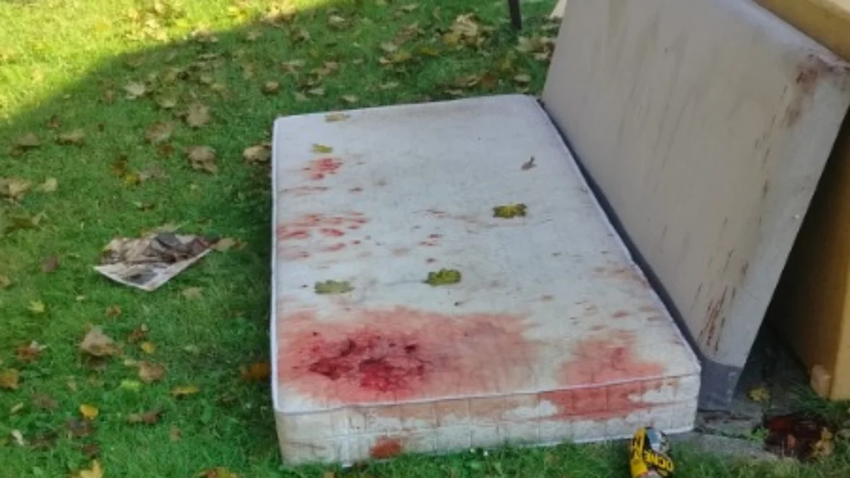 Ślady krwi miały się znajdować nie tylko na materacu, ale również na koszach, stojących nieopodal samochodach, chodniku i na trawie. Co do ostatniego, jesteśmy w stanie to potwierdzić ze stuprocentową pewnością, ponieważ będąc na miejscu kilka dni po zdarzeniu zastaliśmy taki widok.