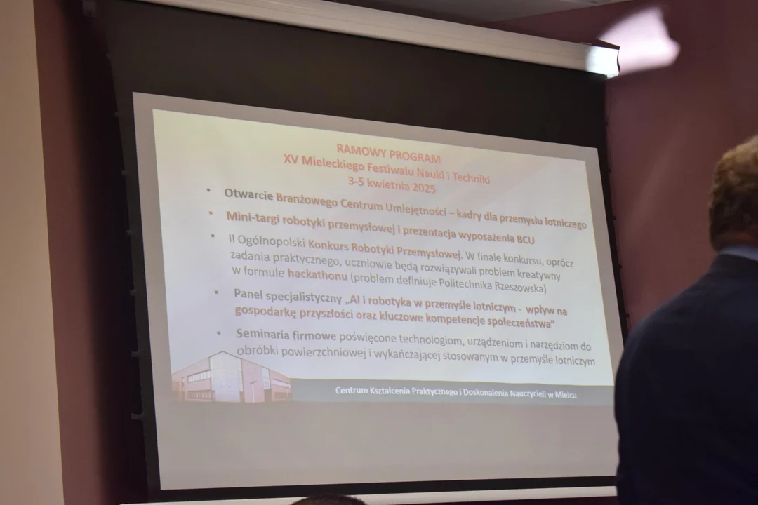 Finał Konkursu Robotyki Przemysłowej zbiegnie się z jubileuszowym XV Mieleckim Festiwalem Nauki i Techniki, który odbędzie się w dniach 3-5 kwietnia 2025 r. W ramach Festiwalu planowane jest otwarcie „Branżowego Centrum Umiejętności – kadry dla przemysłu lotniczego”. Odbędą się także wykłady i panele dyskusyjne poświęcone sektorowym ramom kwalifikacji. Kulminacyjnym punktem wydarzenia będzie konferencja zatytułowana „AI i robotyka w przemyśle lotniczym – wpływ na gospodarkę przyszłości oraz kluczowe kompetencje społeczeństwa”.W konferencji uczestniczyli starosta powiatu mieleckiego Kazimierz Gacek, wicestarosta Andrzej Bryła oraz przedstawiciele Politechniki Rzeszowskiej. Dyskusje skupiły się na roli nowoczesnych technologii oraz sposobach zachęcenia młodzieży do wyboru kierunków technicznych. Zgodnie stwierdzono, że popyt na specjalistów z takich dziedzin jak automatyka czy mechatronika będzie nieustannie wzrastał.