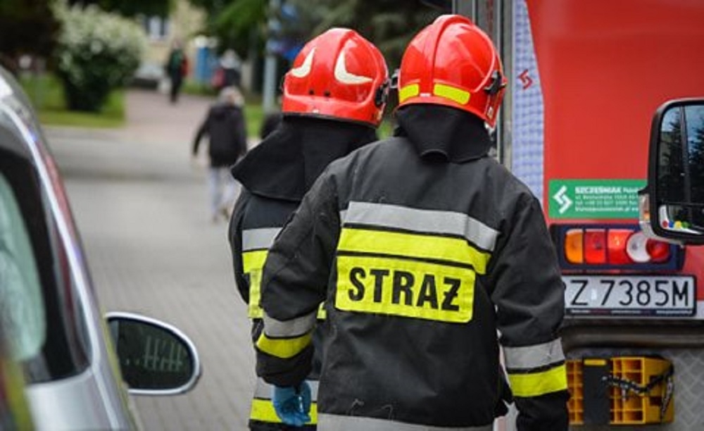 Blacha znajdowała się tuż nad chodnikiem. Strażacy przy użyciu drabiny usunęli zwisającą część rynny.