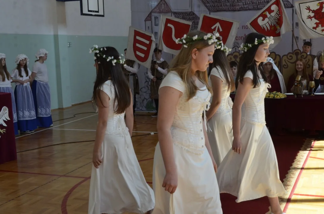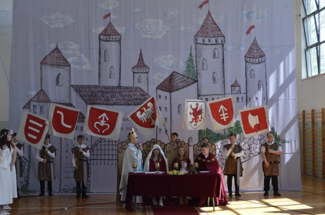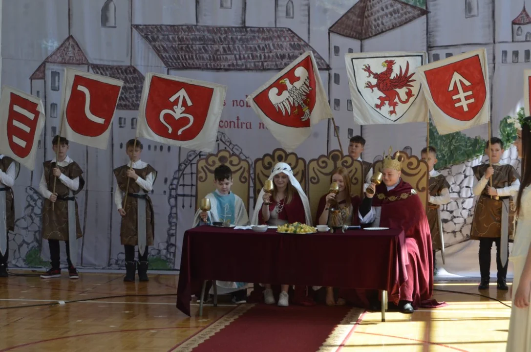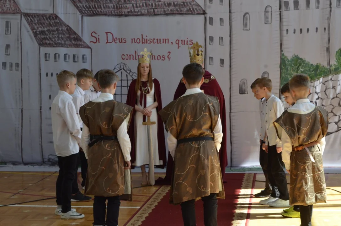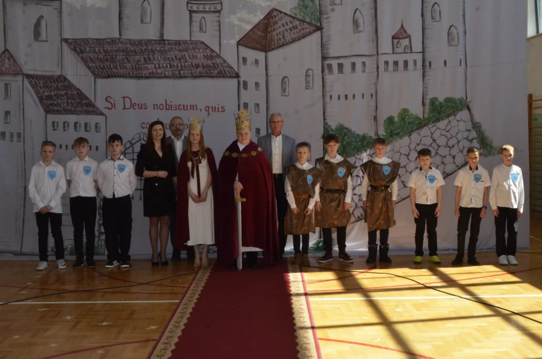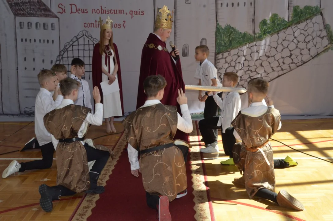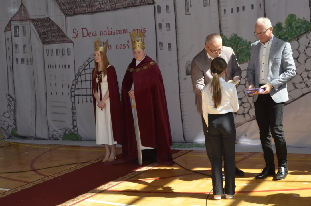 Dzisiejsza uroczystość była zwieńczeniem wielu działań podejmowanych w naszej szkole w ramach tego projektu, był szkolny konkurs na monetę Chrobrego, turniej rycerski - gra edukacyjna , pasowanie na rycerza , dzień z Chrobrym ( możliwość zrobienia zdjęcia z królem- nad którym czuwała pani Natalia Wąż).