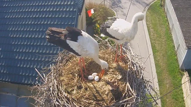Trzecie jajo Kajtka i Balbiny to świetna wiadomość, ale wkrótce może się ich pojawić więcej. Samice bociana białego składają jaja co 2 dni. Mogą ich mieć od 1 do nawet 7. To wczesny termin, gdyż bociany składają jaja od połowy kwietnia, a najczęściej pod koniec miesiąca. Tymczasem pierwsze jajo w gnieździe borowskich bocianów pojawiło się 3 kwietnia.