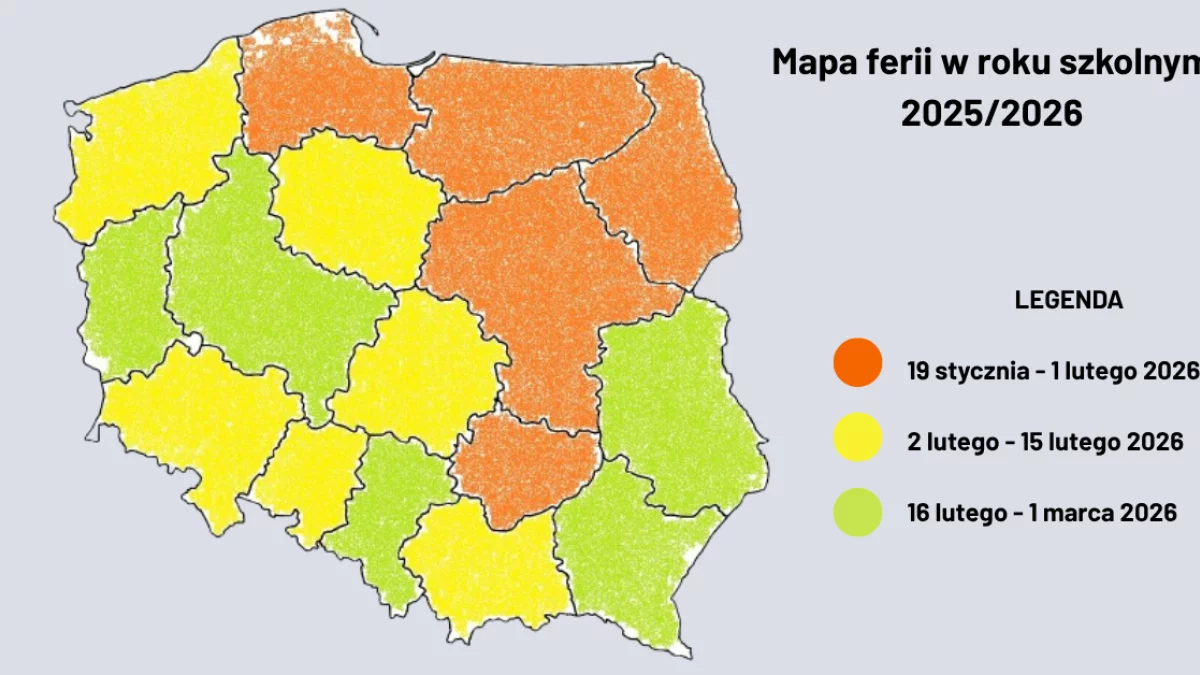 W roku szkolnym 2025/2026 ferie zimowe w Polsce zaplanowano w trzech turach, obejmujących różne grupy województw. Jako pierwsi, od 19 stycznia do 1 lutego 2026 roku, odpoczywać będą uczniowie z województw: mazowieckiego, pomorskiego, podlaskiego, świętokrzyskiego oraz warmińsko-mazurskiego. Następnie, w terminie od 2 do 15 lutego 2026 roku, przerwę zimową rozpoczną dzieci i młodzież z województw dolnośląskiego, kujawsko-pomorskiego, łódzkiego, zachodniopomorskiego, małopolskiego i opolskiego. Ostatnia tura ferii potrwa od 16 lutego do 1 marca 2026 roku i obejmie uczniów z województw podkarpackiego, lubelskiego, wielkopolskiego, lubuskiego oraz śląskiego. Poniżej skrót najważniejszych informacji: