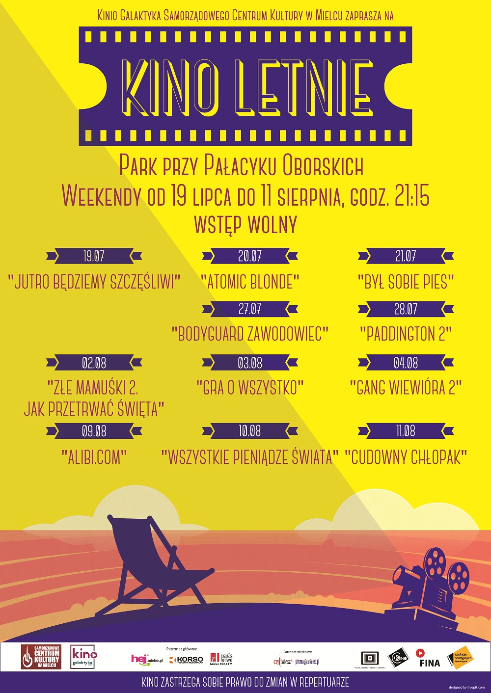 Start zawsze o godz. 21:15 po zachodzie słońca. Wstęp na wszystkie seanse Kina Letniego jest bezpłatny.