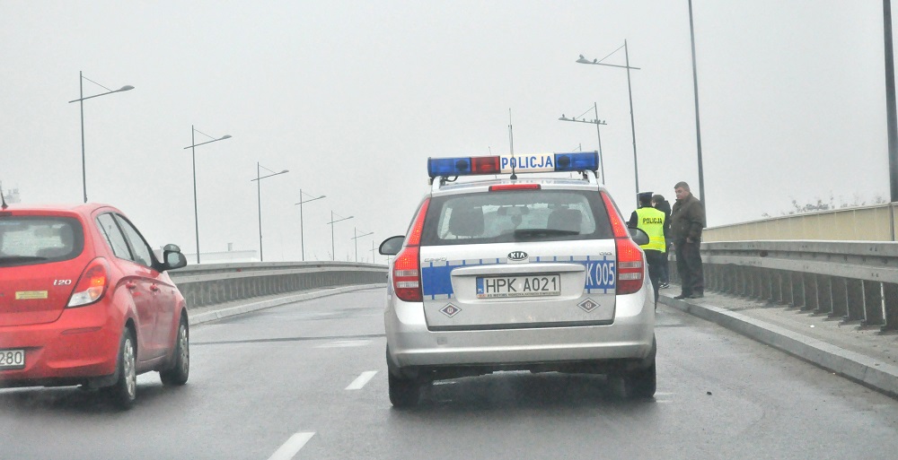 Kolizja dwóch samochodów na wiadukcie. Policjanci wstrzymali ruch na jednym z pasów.