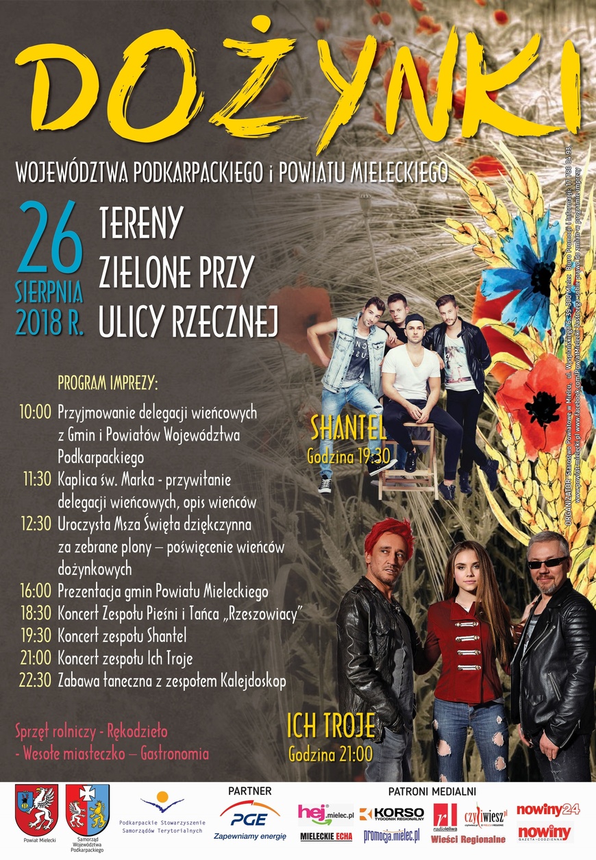 Koncertowy maraton wystartuje o godzinie 18:30. Otworzy go występ Zespołu Pieśni i Tańca „Rzeszowiacy” im. Janusza Mejzy. Następnie, o godzinie 19:30, na scenie zagra wschodząca gwiazda muzyki rozrywkowej – zespół Shantel, a o 21:00 rozpocznie się show kultowej grupy Ich Troje. Wspólne świętowanie zwieńczy zabawa taneczna z zespołem Kalejdoskop.