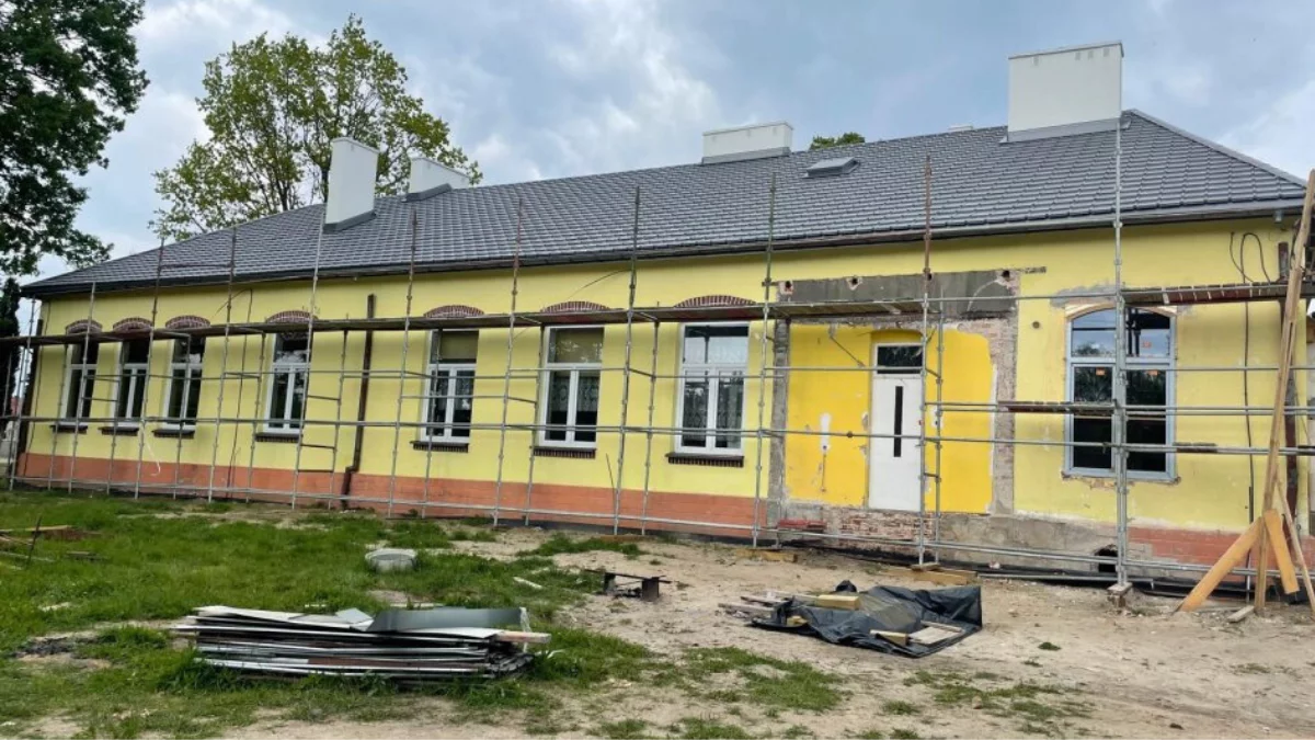 Zakres prowadzonych robót jest szeroki. Obejmuje m.in. rozbiórki, zmianę konstrukcji dachu i ułożenie nowego pokrycia, a także montaż nowych okien, drzwi i systemu rynnowego. Zadbano także o docieplenie ścian zewnętrznych, fundamentów i kominów, wykonanie nowej elewacji, schodów wejściowych oraz montaż detali architektonicznych. Prace są już na końcowym etapie, a efekt widać gołym okiem – budynek zyskał nową jakość i wygląd.
