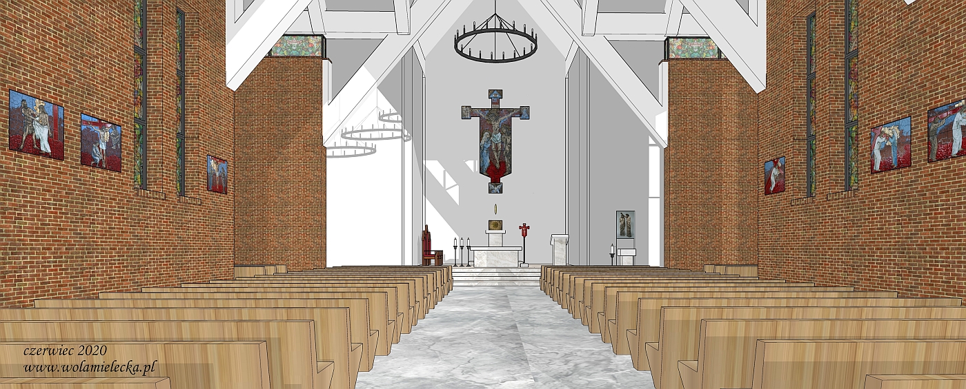 We wnętrzu kościoła zostają wykorzystane ściany z ozdobnej cegły. Na ścianie ołtarzowej znajdzie się kompozycja mozaikowa w której zostanie przedstawiona scena ukrzyżowania Jezusa w obecności Matko Bożej i św. Jana. Krzyż ma formę krzyża franciszkańskiego. Ściana ołtarzowa będzie mieć biały kolor. Parafia w Woli Mieleckiej istnieje od 2009 roku. Kościół parafialny jest już wybudowany. Teraz trwają prace wykończeniowe.