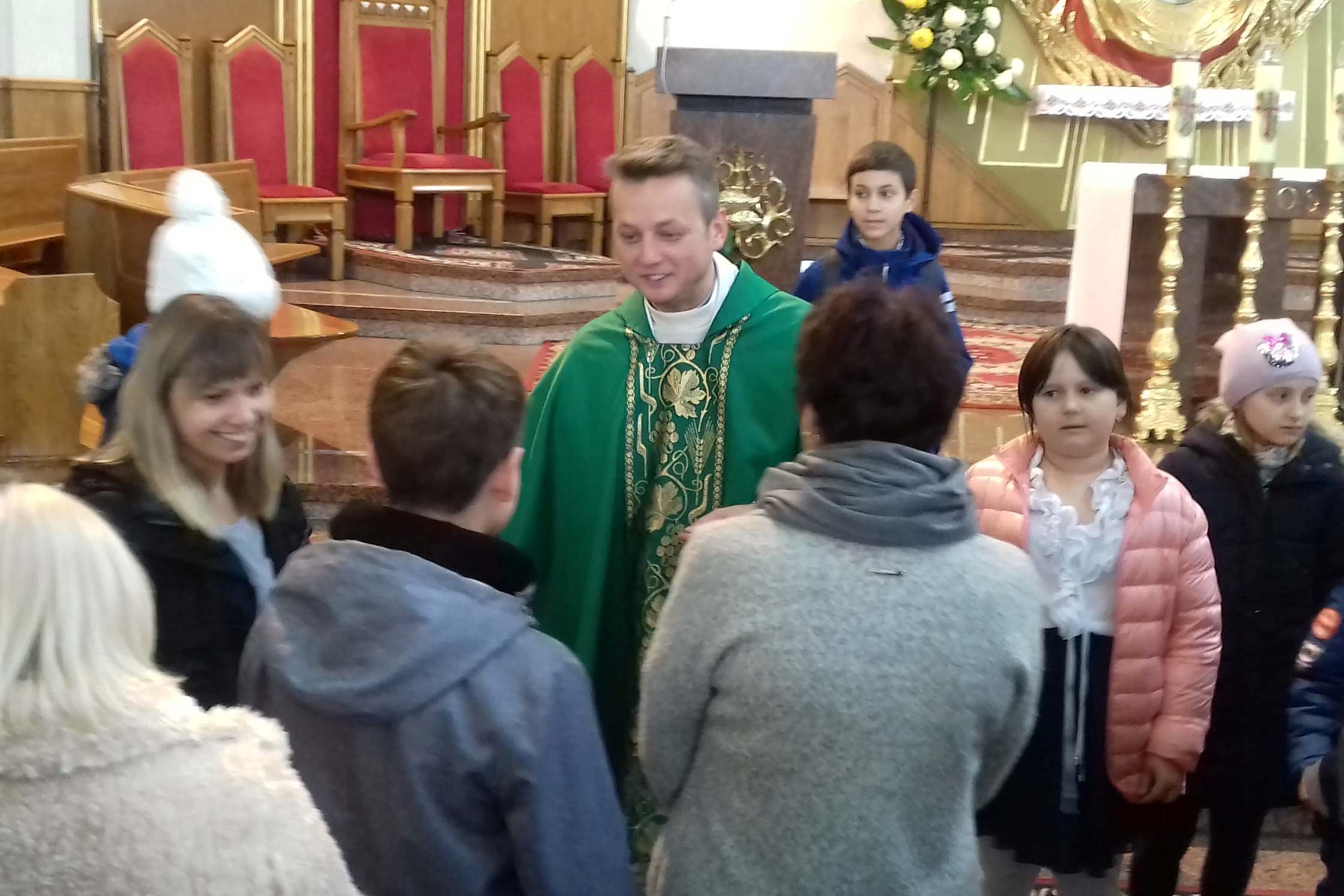 Po zakończonej Mszy Świętej parafianie i dzieci jeszcze długo pozostali w kościele, by jeszcze raz uścisnąć rękę księdzu Piotrowi i życzyć powodzenia.