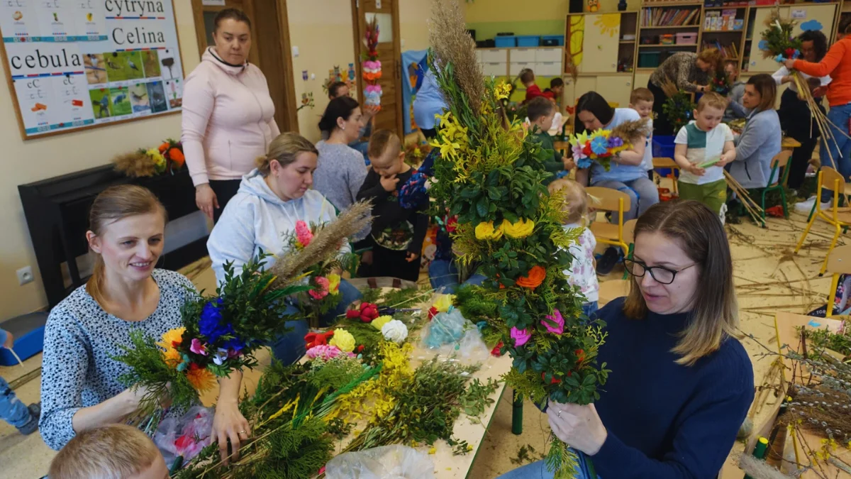 Na stołach pojawiły się gałązki bukszpanu, trzciny, bazie i sterty kolorowej bibuły. W ruch poszły nożyczki, kleje i dziecięce paluszki. Dzieci wraz z bliskimi pracowały z ogromnym zaangażowaniem. Każda palma była inna – jedne pełne kolorów i ozdób, inne skromniejsze, ale każda miała w sobie coś wyjątkowego, bo powstała dzięki wspólnemu wysiłkowi i sercu włożonemu w pracę.