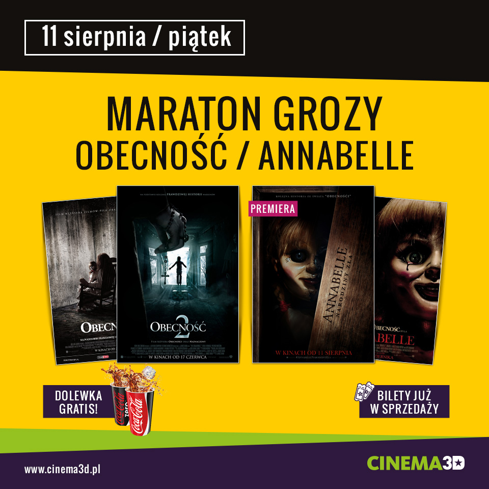 Maratony filmowe to wyjątkowa okazja dla wszystkich, dla których jeden film to za mało. Tym razem CINEMA3D zaprasza wielbicieli horroru na nocne oglądanie filmów. W piątek 11 sierpnia, kino przygotowało dla fanów tego gatunku na Nocny Maraton Horrorów - Obecność/Annabelle.