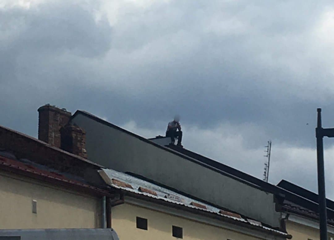 Mężczyzna siedzi na dachu kamienicy w Mielcu