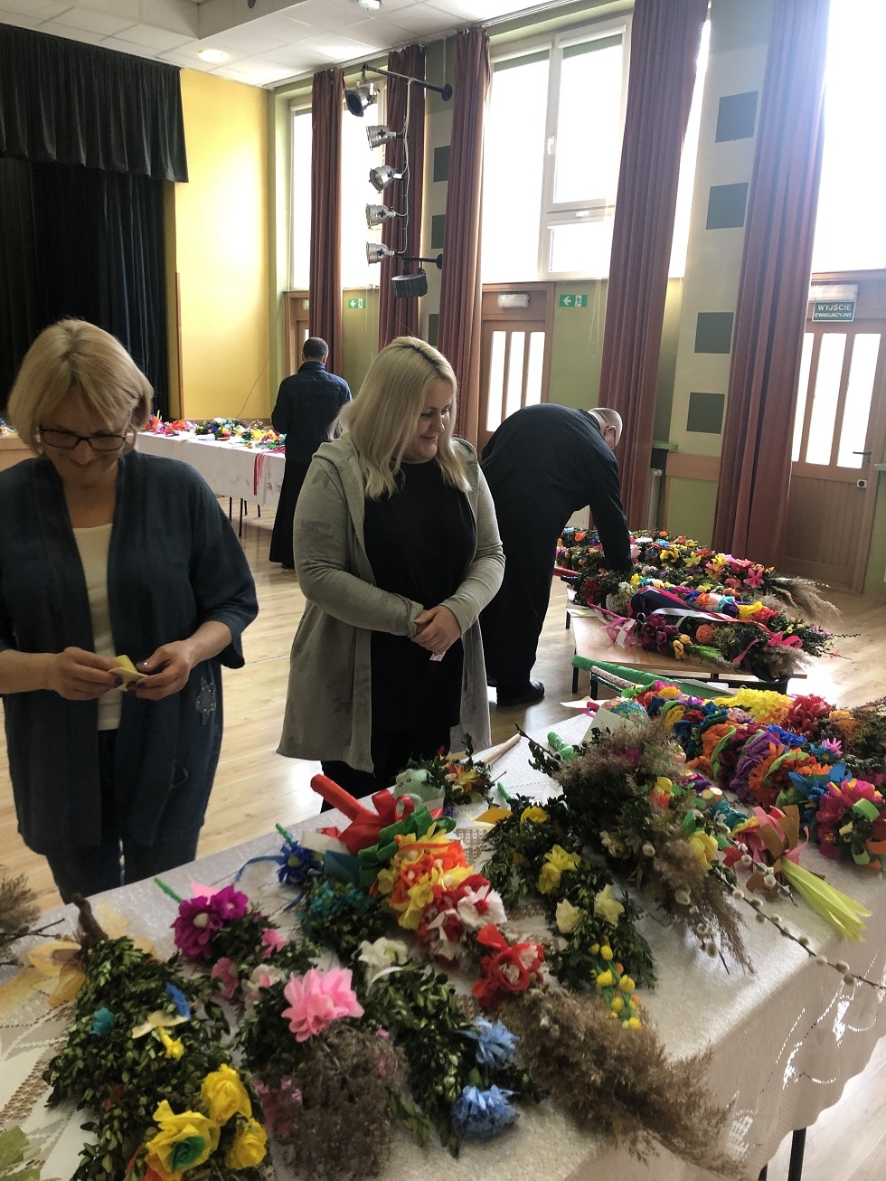 Kolorowe kwiaty z bibuły, wstążki, bukszpan, zielone elementy – spowodowały że palmy są piękne, niepowtarzane i na pewno doskonale wpisują się w założenia konkursu.