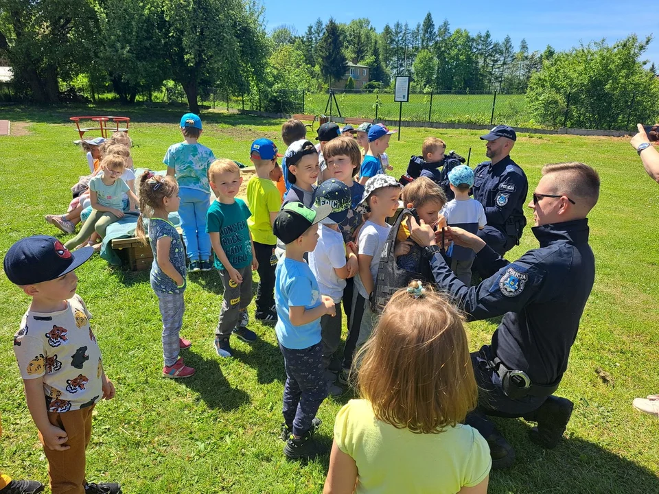 Największe zainteresowanie dzieci wzbudził jednak policyjny radiowóz, do którego przedszkolaki mogły wsiąść. Dzieci z zapałem przymierzały również policyjną kamizelkę z niezbędnym wyposażeniem oraz z zaciekawieniem oglądały kajdanki i radiostację. Funkcjonariusze opowiadali o pracy policjanta, która przepełniona jest pomocą innym ludziom i przyjaźnią z najmłodszymi.
