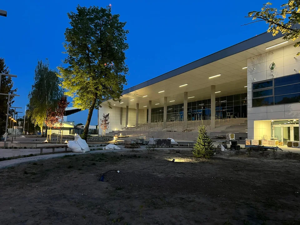 Udało się zachować część stojących tu do tej pory drzew, które wraz z ławkami, parkowymi siedziskami i innymi elementami tzw. małej architektury wkomponowane zostały w nowe otoczenie hali.
