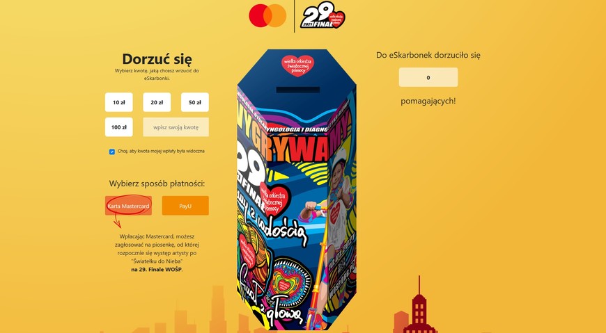 W tym roku, przez pandemię, ta ostatnia forma będzie nabardziej popularna. Każda z e-skarbonek dostępna jest pod linkiem zaczynającym się od eskarbonka.wosp.org.pl. Strona ta chroniona jest przez bezpieczne połączenie i posiada certyfikat bezpieczeństwa. Po wybraniu metody płatności użytkownik jest przekierowywany do operatora płatności, którego strona jest zabezpieczona w analogiczny sposób. Wsparcie skarbonki sfinalizować można kartą Mastercard lub za pośrednictwem popularnej platformy PayU.