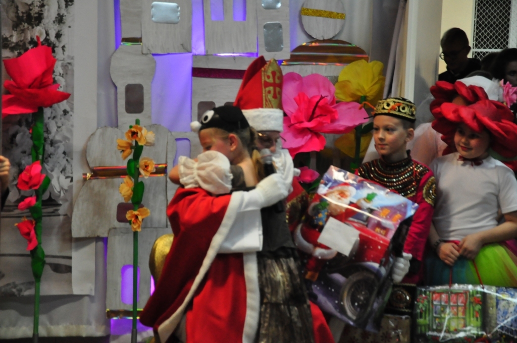 Oprócz wyczekiwanego gościa, zebrane dzieci i rodzice mogli cieszyć się przedstawieniem, przygotowanym przez wszystkich uczniów z klas 1-3 przy pomocy swoich wychowawczyń.