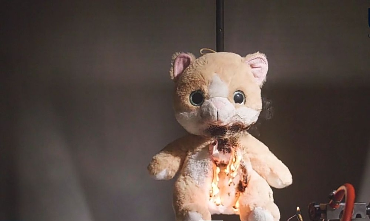 Łatwiej jest zrozumieć podpalenie misia, bo tak sprawdza się łatwopalność pluszaka.