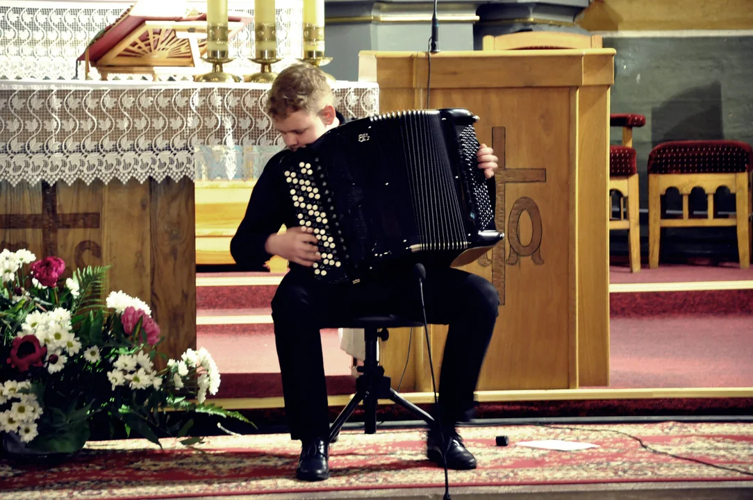 Młody akordeonista zagrał nie tylko pieśni religijne. Koncert zgromadził w świątyni olbrzymią ilość widzów, a oklaskom nie było końca.