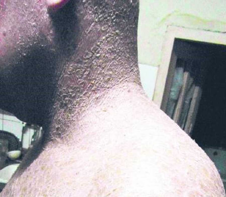 To bardzo rzadki problem, polegający na nadmiernym rogowaceniu się naskórka, do tego stopnia, że skóra nawarstwia się i pęka, przypominając łuski ryby. Tworzą się na niej rany i ropnie, może dojść nawet do zagrażającego życiu zakażenia.