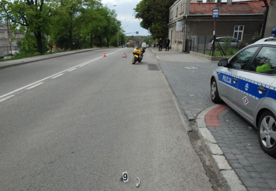 82-letni mężczyzna, kierujący pojazdem marki Smart, podczas skrętu w lewo, nie ustąpił pierwszeństwa przejazdu kierującemu motocyklem marki Honda. W celu uniknięcia zderzenia motocyklista najechał na chodnik, a następnie na znak drogowy. W wyniku zderzenia, mężczyzna z ciężkimi obrażeniami trafił do szpitala, gdzie walczy o życie.