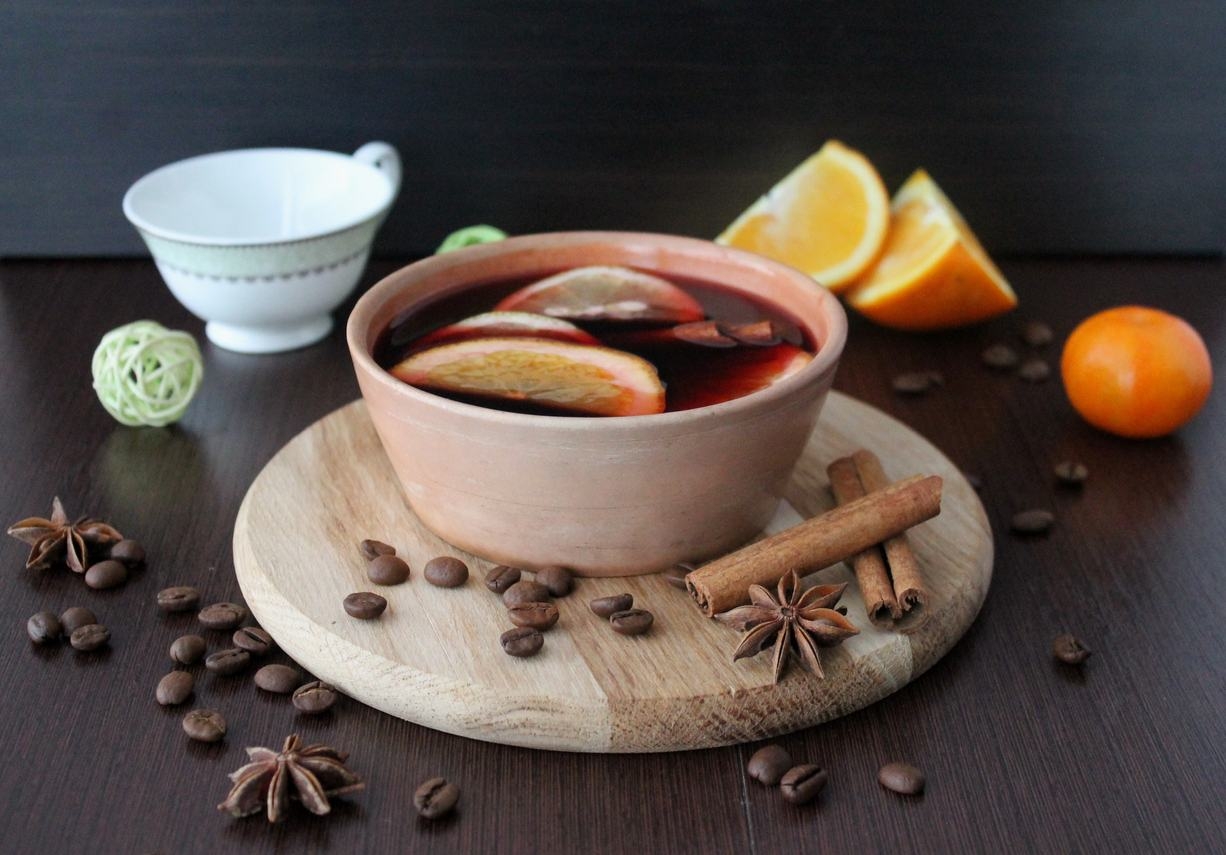 Pomarańczę umyć i pokroić w plastry. Połączyć w garnku wszystkie składniki i podgrzać do temperatury 60 – 80 st. C. Przelać do kubka i wypić zanim ostygnie.