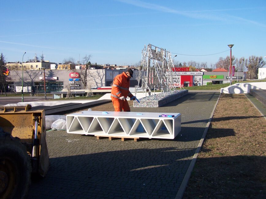Ławki w całości odlane są z wysokiej wytrzymałości betonu UTC, każda waży 483 kg. Dodatkowo w ich otoczeniu postawione zostały dwa kosze na śmieci o pojemności ok. 120 litrów. Na ich dnie znajduje się otwór do odprowadzania wody deszczowej, wyposażony w uchwyt do mocowania worków plastikowych. Podniesione dno umożliwi natomiast swobodny odpływ wody.