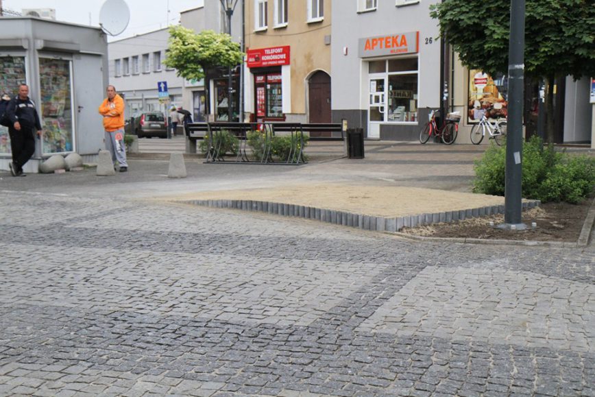 Podjazdy powstały na wniosek złożony przez osoby niepełnosprawne. Niemal wszystkie przystanki autobusowe w mieście umożliwiają rozłożenie specjalnych platform, w które wyposażone są niskopodłogowe autobusy. W Rynku chodniki oraz przystanek są na poziomie równym z jezdnią, dlatego nawet opuszczenie z autobusu platformy powodowało duży problem z wjechaniem wózka do autobusu. Nachylenie platformy było tak duże, że wózki nie były w stanie pokonać tej przeszkody. Groziło to także wywróceniem osoby na wózku inwalidzkim.