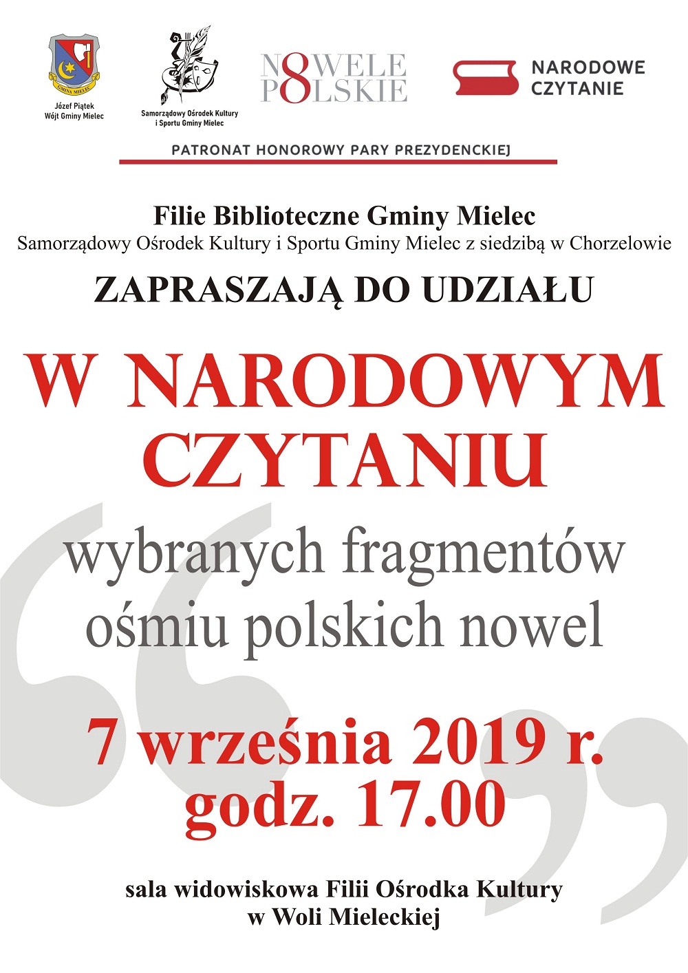 Biblioteki Publiczne Gminy Mielec zapraszają do wzięcia udziału w Narodowym Czytaniu, które odbędzie się 7 września 2019 roku o godzinie 17.00 w Filii Ośrodka Kultury