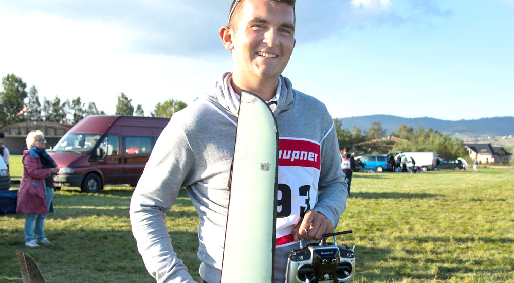 Po południu przyszedł czas na starty rakietoplanów zdalnie sterowanych. W Pucharze Świata nie ma jednak specjalnego podziału na wiek w tej kategorii i mogą w niej startować zarówno seniorzy jak i juniorzy - kto ma model i czuje się na siłach. Właśnie w tej konkurencji o bardzo miłą niespodziankę postarał się Eryk Halaburda. Po dwóch lotach był drugi, należało więc wykonać świetny trzeci lot, żeby móc wejść do finału. W finale zostaje pięciu najlepszych zawodników z danej konkurencji. W trzecim locie Eryk zdobył pełne1000 punktów, latał idealnie 6 minut i precyzyjnie trafił w punkt, w którym miał wylądować.