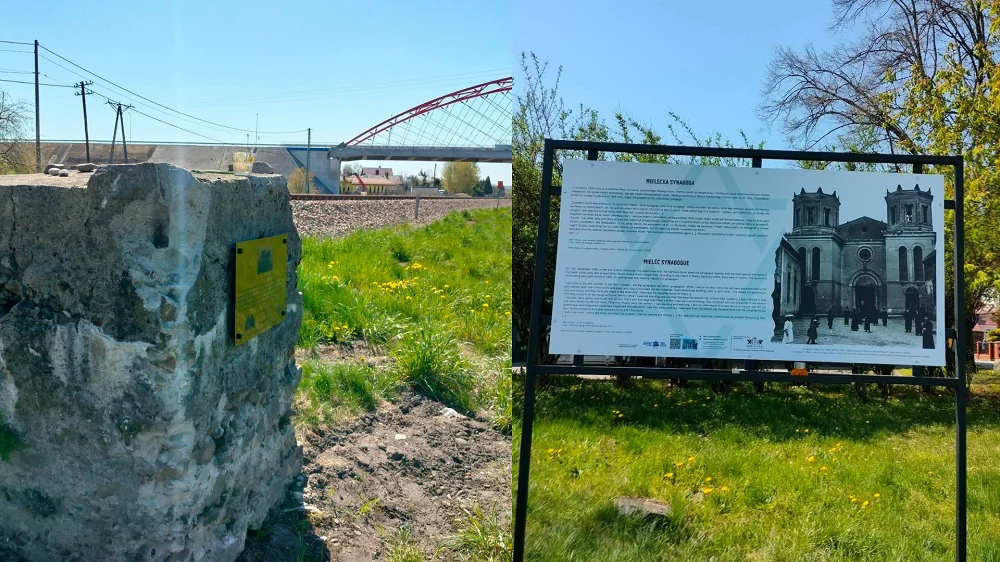 Pierwsza z tablic opisuje historię mieleckiej synagogi, która nie przetrwała II wojny światowej. Dawna świątynia żydowska była "niemym świadkiem" ogromnej tragedii. Na początku wojny spalono tam grupę Żydów.
