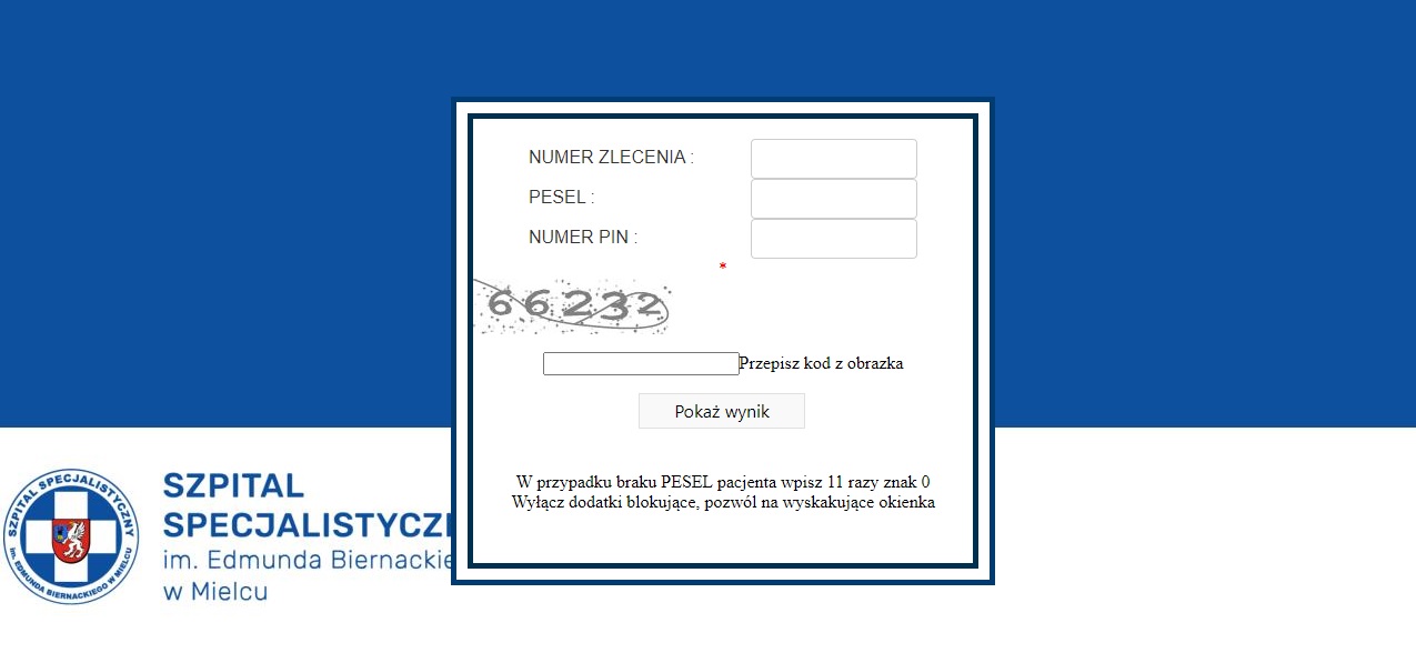 Aby mieć możliwość odebrania wyniku on line, pacjent w rejestracji w Punkcie Pobrań Badań Laboratoryjnych, w momencie zgłoszenia się na badania, musi odebrać specjalny wydruk od rejestratorek medycznych, który zawierał będzie indywidualnie wygenerowany przez system szpitalny numer PIN oraz NR ZLECENIA.