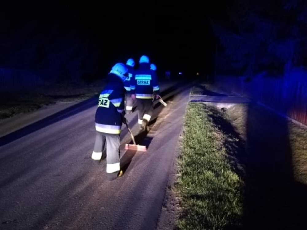 Olej rozlany był na długości 3 kilometrów. Na miejsce został zadysponowany jeden zastęp z Ochotniczej Straży Pożarnej w Przecławiu. Druhowie całkowicie zneutralizowali plamę, likwidując zagrożenie na jezdni.