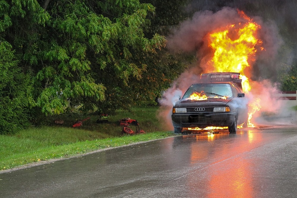 Pali się samochód za mostem w Woli Mieleckiej.