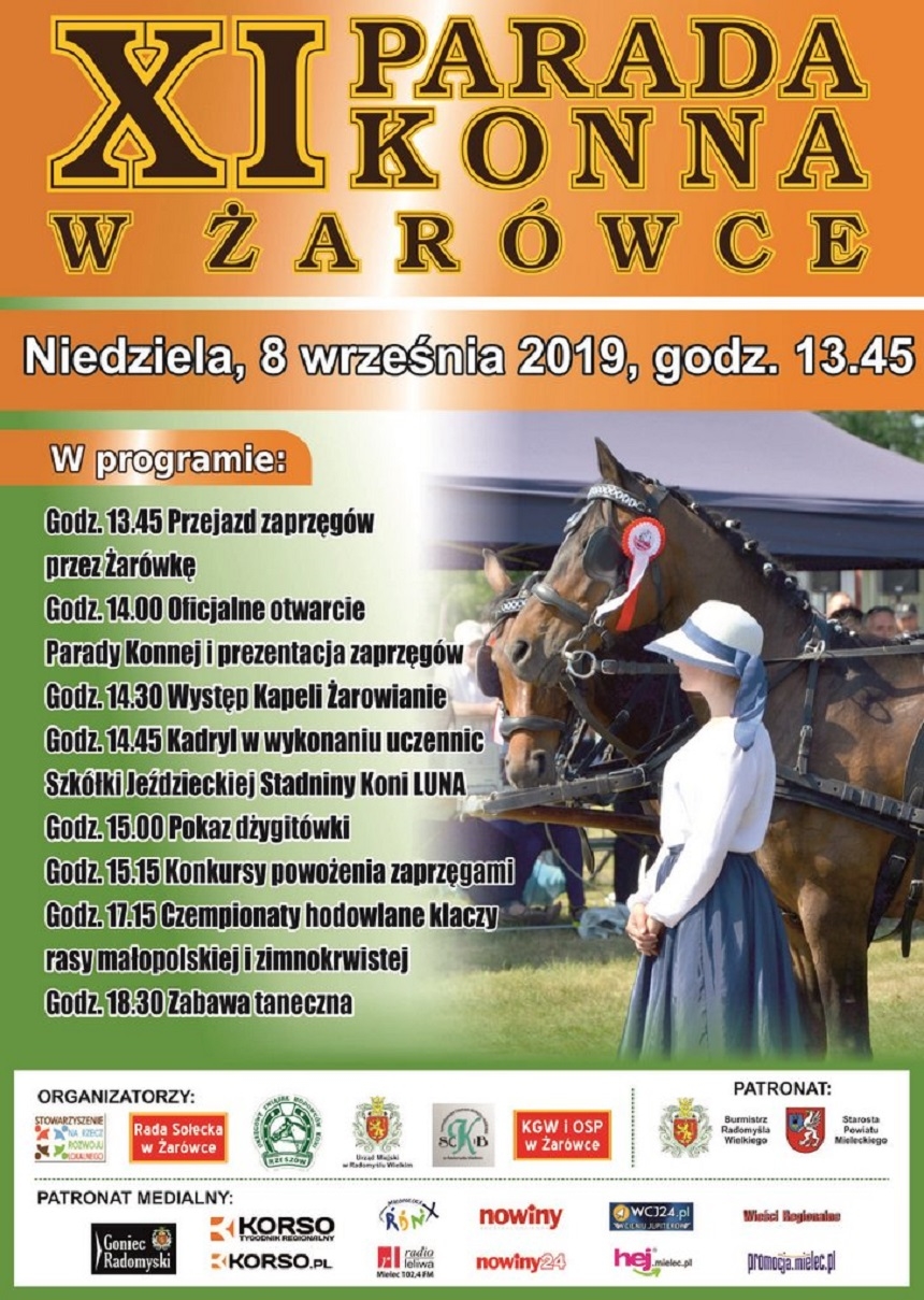 Co organizatorzy przygotowali w tym roku? Na godz. 13.45 zaplanowano przejazd zaprzęgów przez Żarówkę, a po nim oficjalne otwarcie Parady i prezentację jej uczestników. Następnie po krótkim występie kapeli Żarowianie będzie można zobaczyć kadryl, czyli taniec koni ujeżdżanych przez jeźdźców. - Polega on na wykonywaniu różnych figur lub układów choreograficznych. Ta naprawdę efektowna i widowiskowa forma sztuki jeździeckiej, chętnie oglądana przez widzów, wykonywana jest przy muzyce, a konie poruszają się w jej rytm – wyjaśnia Krzysztof Babiarz z Urzędu Miejskiego w Radomyślu Wielkim. Pokaz przeprowadzą uczennice Szkółki Jeździeckiej Stadniny Koni LUNA z Kawęczyna.