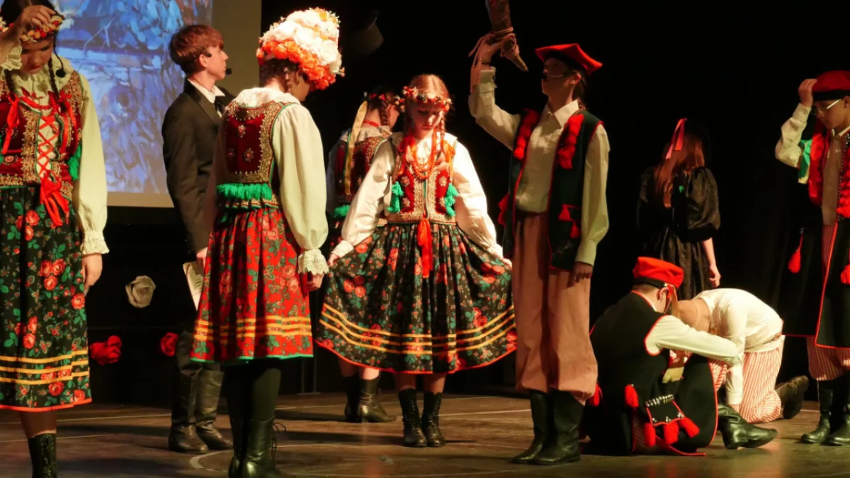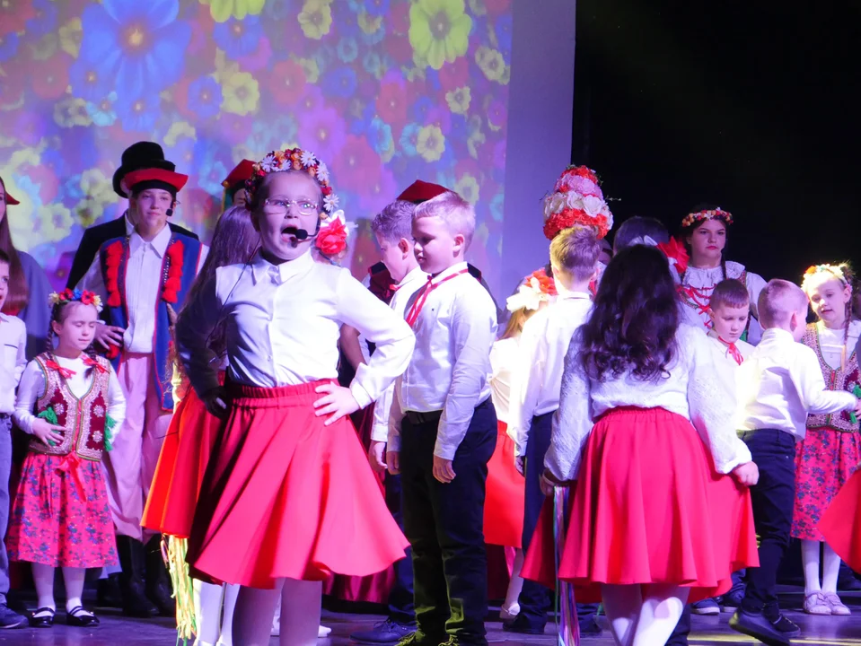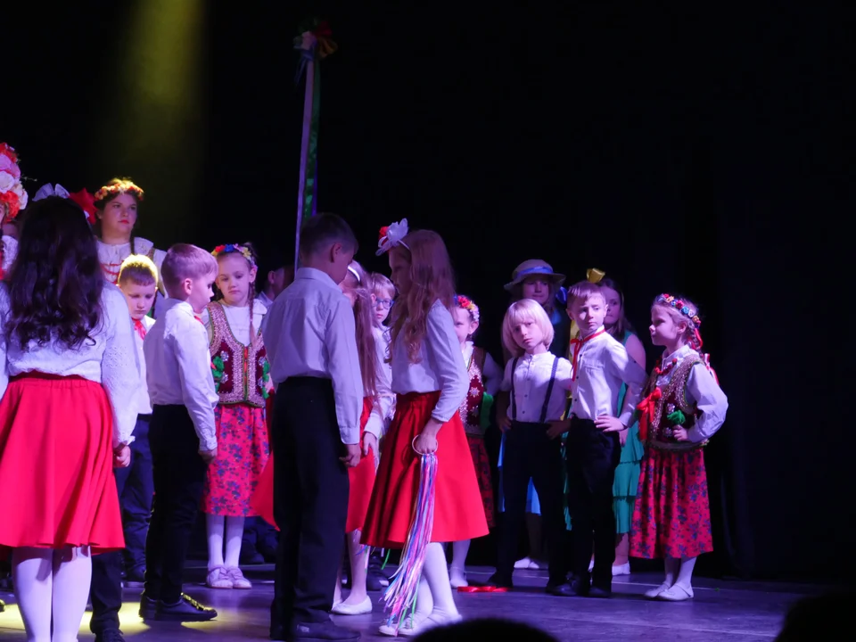 Najpierw na scenie zaprezentowali się młodsi uczniowie, wykonując żywiołowo krakowiaka.