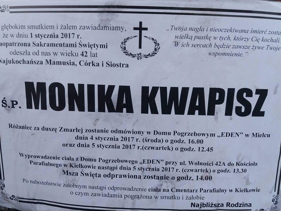 Bliscy śp. Moniki Kwapisz, chcieliby, by jej znajomi towarzyszyli jej w ostatniej drodze. Pogrzeb odbędzie się w czwartek, 5 stycznia, o godzinie 14 w Kościele Parafialnym w Kiełkowie. Łącząc się w żałobie i smutku po śmierci tragicznie zmarłej Moniki Kwapisz, redakcja Tygodnika Regionalnego Korso składa rodzinie i najbliższym kondolencje i wyrazy współczucia.