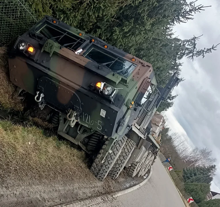 Pojazd wojskowy przechylił się i wpadł do rowu