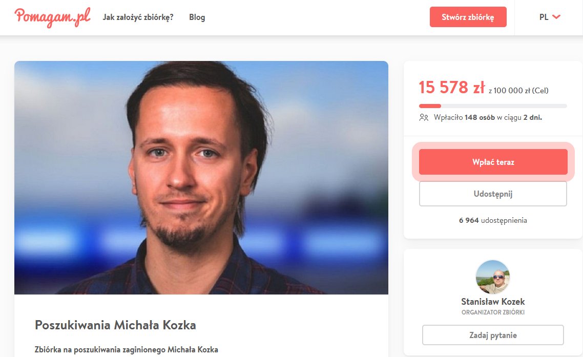 Aby móc kontynuować poszukiwania, rodzina i przyjaciele Michała założyli zbiórkę na portalu pomagam.pl. Uzbierane pieniądze zostaną przeznaczone na wynagrodzenie ekip poszukiwawczych, koszty zakwaterowania, wyżywienia, ewentualnych przelotów specjalistów, którzy podejmą się kontynuacji poszukiwań.