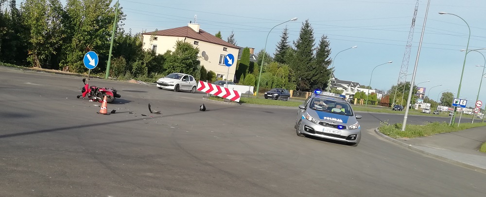 Motorowerzysta został potrącony przez poloneza. Zespół ratowniczy zawiózł motorowerzystę do szpitala.
