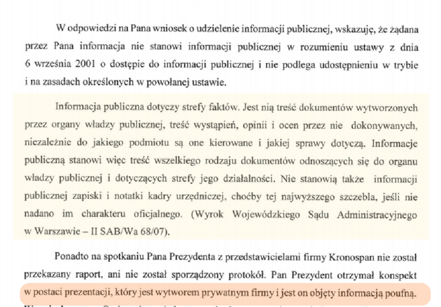 - Pamiętacie pewnie niedawne spotkanie Prezydenta Jacka Wiśniewskiego z przedstawicielami firmy Kronospan Mielec? Chcieliśmy dowiedzieć się, o czym tam rozmawiano i zobaczyć "raport", na który powoływał się Pan Prezydent. Niestety, według urzędu to "nie jest informacja publiczna". Cóż. Jeśli to ma być "nowa jakość" działalności urzędników, to kiepsko rokuje - piszą w tej sprawie przedstawiciele Stowarzyszenia "Specjalna Strefa Ekologiczna" w Mielcu.