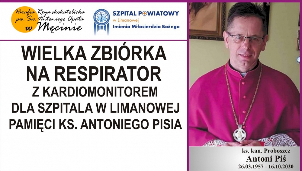 16 października ks. proboszcz Antoni Piś przegrał walkę z wirusem COVID-19. Aby wyrazić wdzięczność za jego dobroć, zaangażowanie w sprawy lokalnej społeczności i wielką aktywność duszpasterską, parafianie pragną ufundować respirator wraz z kardiomonitorem dla Szpitala w Limanowej.