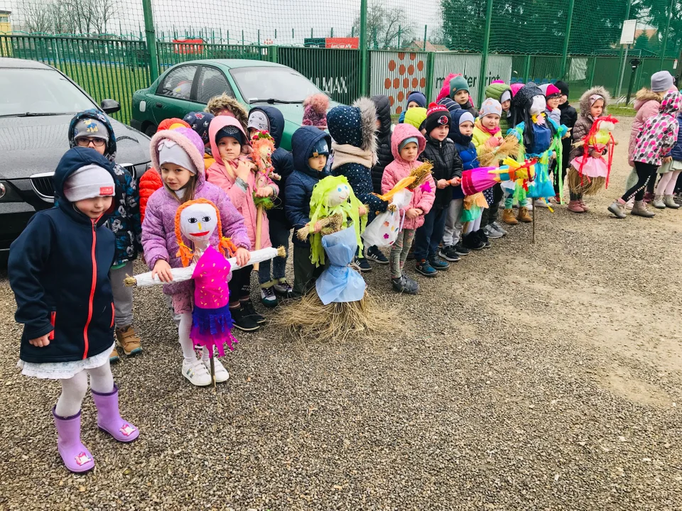 Następnie przedszkolaki barwnym korowodem, tradycyjnie przemaszerowały ulicami Chorzelowa z gaikami — witając wiosnę.