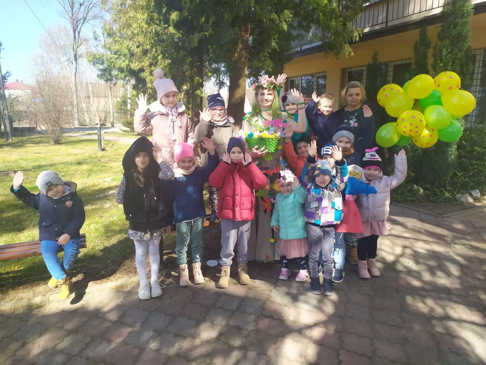 Po zabawie przedszkolaki wybrały się z Panią Wiosną na spacer, podczas którego zostawiały kwiaty w bramach pobliskich domów. Za każdy zostawiony kwiatuszek przedszkolaki dostały po baloniku.