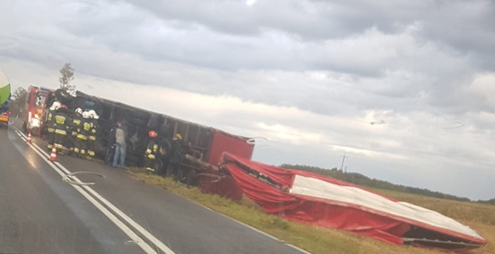 Przewrócony samochód ciężarowy zablokował jeden pas jezdni. Na trasie Radomyśl Wielki - Lisia Góra doszło do utrudnień na drodze. Strażacy zabezpieczyli teren i pomogli w udrożnieniu jezdni.
