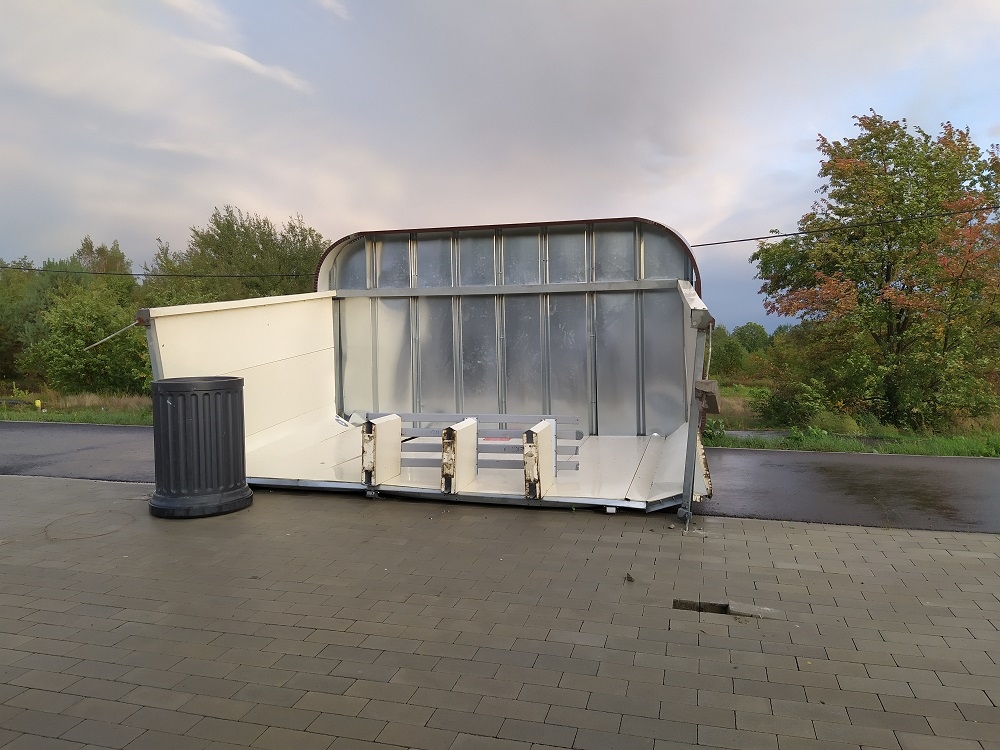 W Majdanie Królewskim czekający na autobus nie schowają się już przed deszczem pod dachem tego przystanku. Jak widać siła wiatru była tak duża, że go przewróciła.
