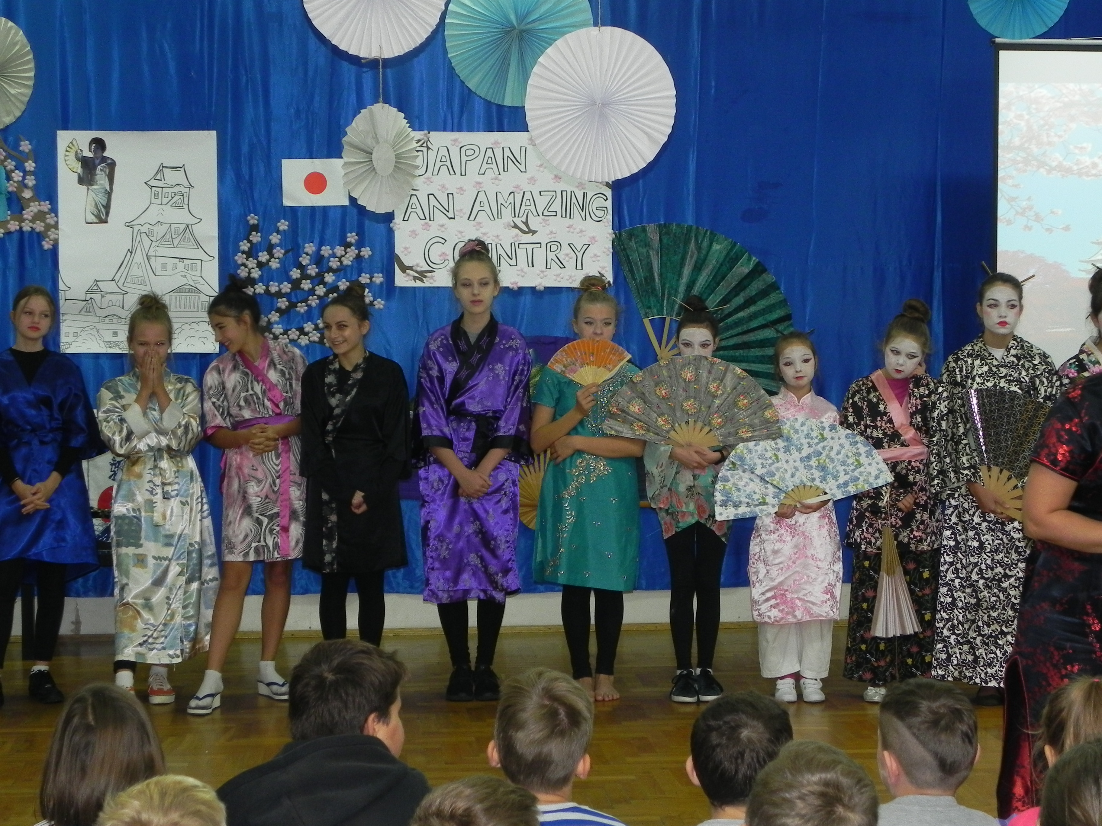Uczniowie dowiedzieli się wiele interesujących faktów o Japonii, słuchając informacji w języku angielskim, które przygotowała dla nich Pani Barbara Żala – nauczycielka języka angielskiego. Uczniowie mieli okazję nauczyć się pisać i wymawiać niektóre słowa po japońsku. Dla uczniów było to spore wyzwanie.