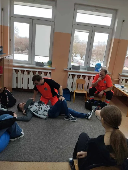 Zajęcia z udzielania pierwszej pomocy dla klas V-VIII poprowadzili ratownicy medyczni z Podkarpackiej Stacji Pogotowia Ratunkowego w Mielcu: Waldemar Polit oraz Kacper Polit, który jest absolwentem tej szkoły.
